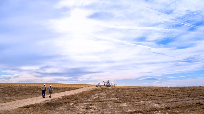 Workers walk on a dirt road toward a wellhead in Greeley, Colorado.